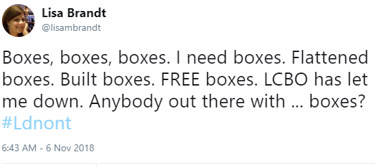 A Londoner named Liz responded almost immediately and let me and Derek come over and pick up a huge stack of U-Haul boxes – the good ones. Another woman – Amanda – dropped off a bunch of great boxes. I finally had to say thanks, but no more boxes, please! The London Free Press chose this as their “tweet of the day” for the next day’s paper. People are good. They come through when you need ’em. That’s my belief and I’m sticking to it!