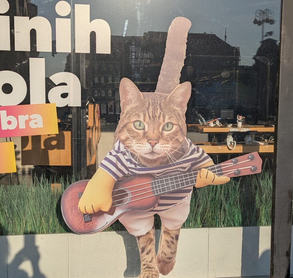 We also toured the Chocolate Museum. It’s a tasting tour as well as an educational one. Another thing I love about different cities is their advertising. (See the guitar-playing cat and barber shop sticker!)